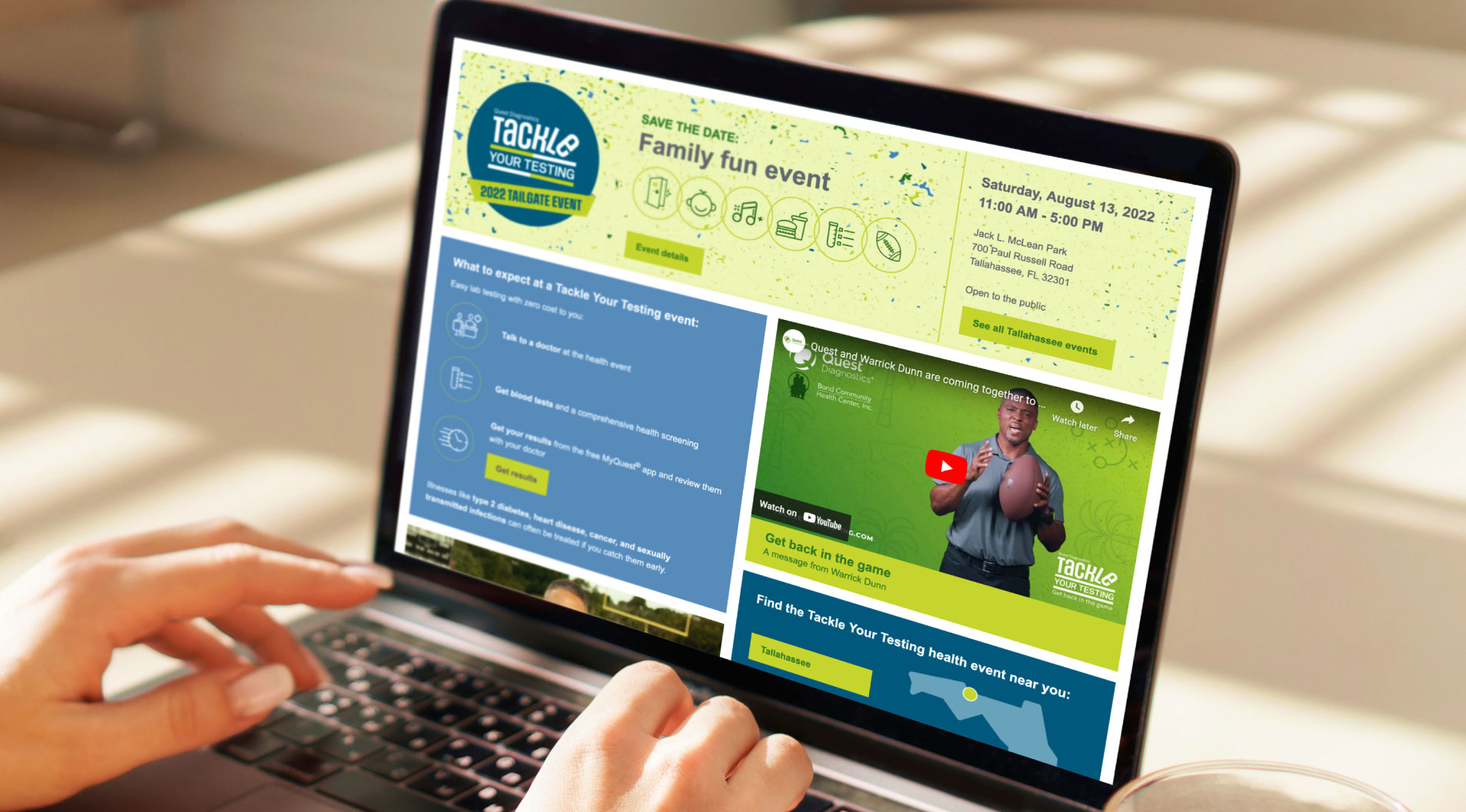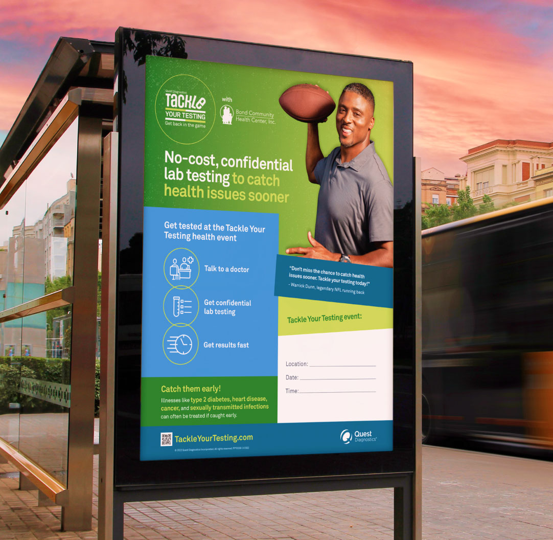 We created the “Tackle Your Testing” identity and campaign platform to rally community members to health events in Tampa, Tallahassee, and Miami where they could talk to a doctor about their health and get lab tests. These neighborhood events empowered people from all walks of life to take control of their health.